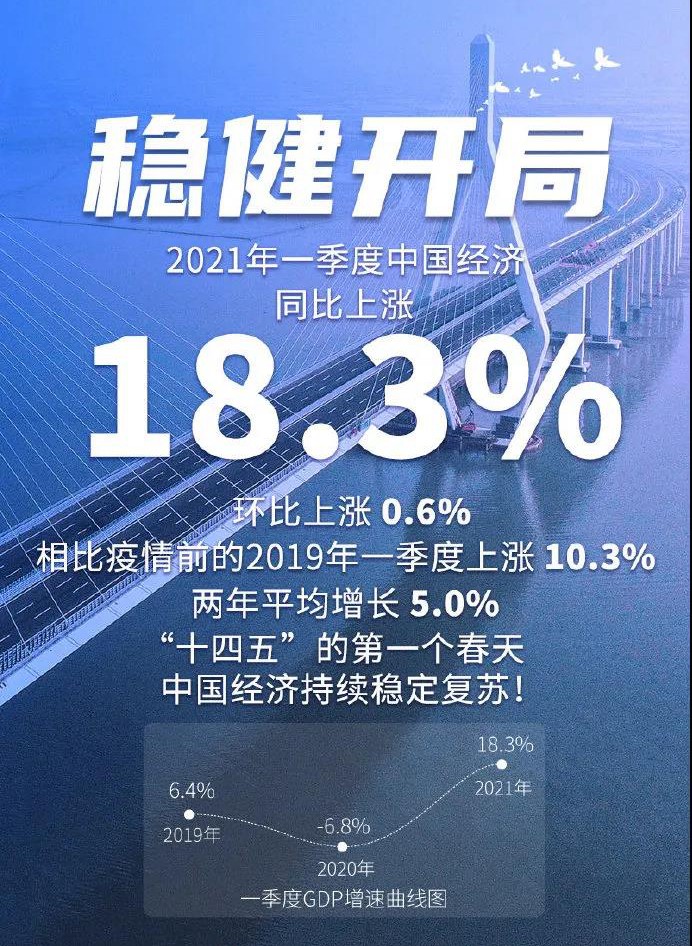 4月16日,國家統計局發布數據,初步核算,一季度國內生產總值249310億元,同比上漲18.3%,環比上漲0.6%,相比2019年上漲10.3%,兩年平均增長5.0%,實現穩健開局。