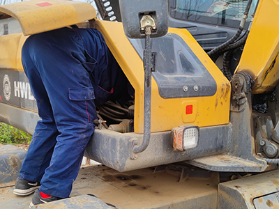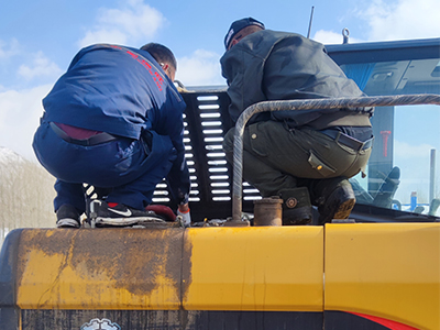 1.檢查大小臂、鏟斗、駕駛室、空濾、配重等各部件情況是否有開裂、損壞、松動等情況,并及時更換調整。